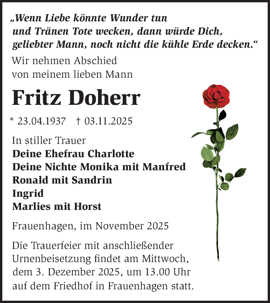 Hier finden Sie alle Traueranzeigen aus der Zeitung, die bisher für Fritz Doherr erschienen sind. Weitere Traueranzeigen, die in der Zeitung erscheinen, werden hier ebenfalls aufgelistet
