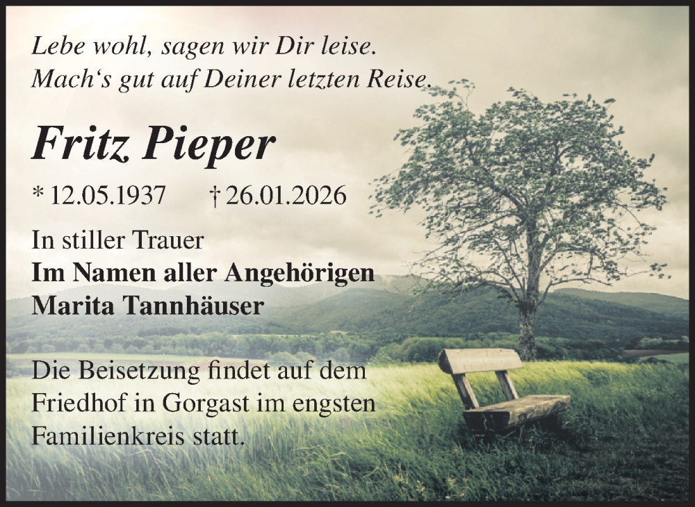 Hier finden Sie alle Traueranzeigen aus der Zeitung, die bisher für Fritz Pieper erschienen sind. Weitere Traueranzeigen, die in der Zeitung erscheinen, werden hier ebenfalls aufgelistet