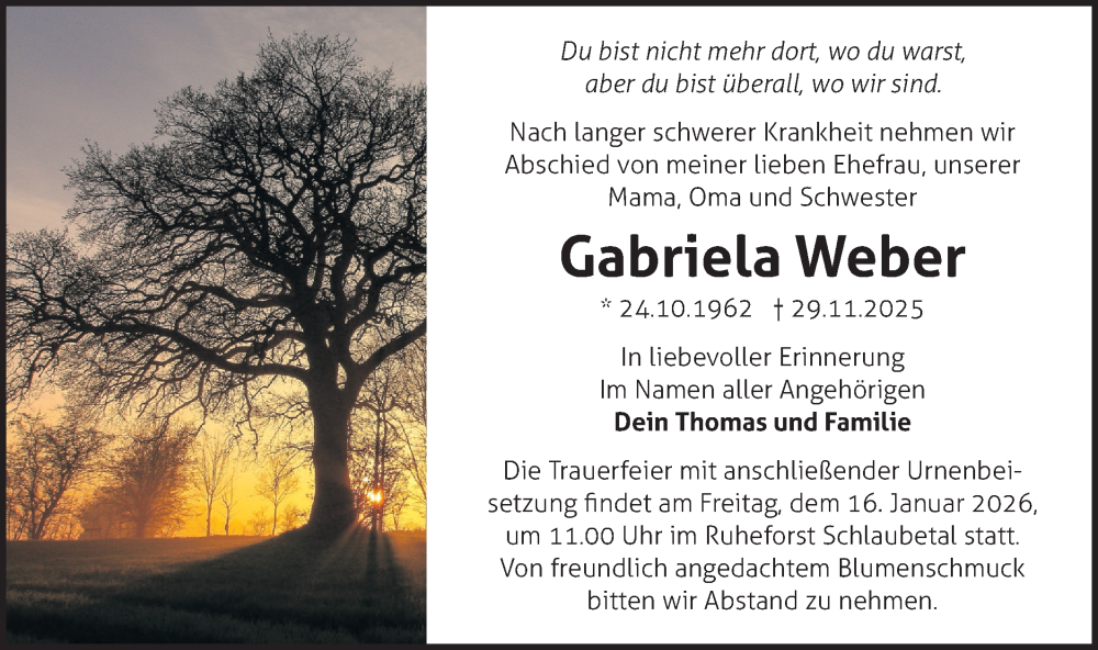 Hier finden Sie alle Traueranzeigen aus der Zeitung, die bisher für Gabriela Weber erschienen sind. Weitere Traueranzeigen, die in der Zeitung erscheinen, werden hier ebenfalls aufgelistet