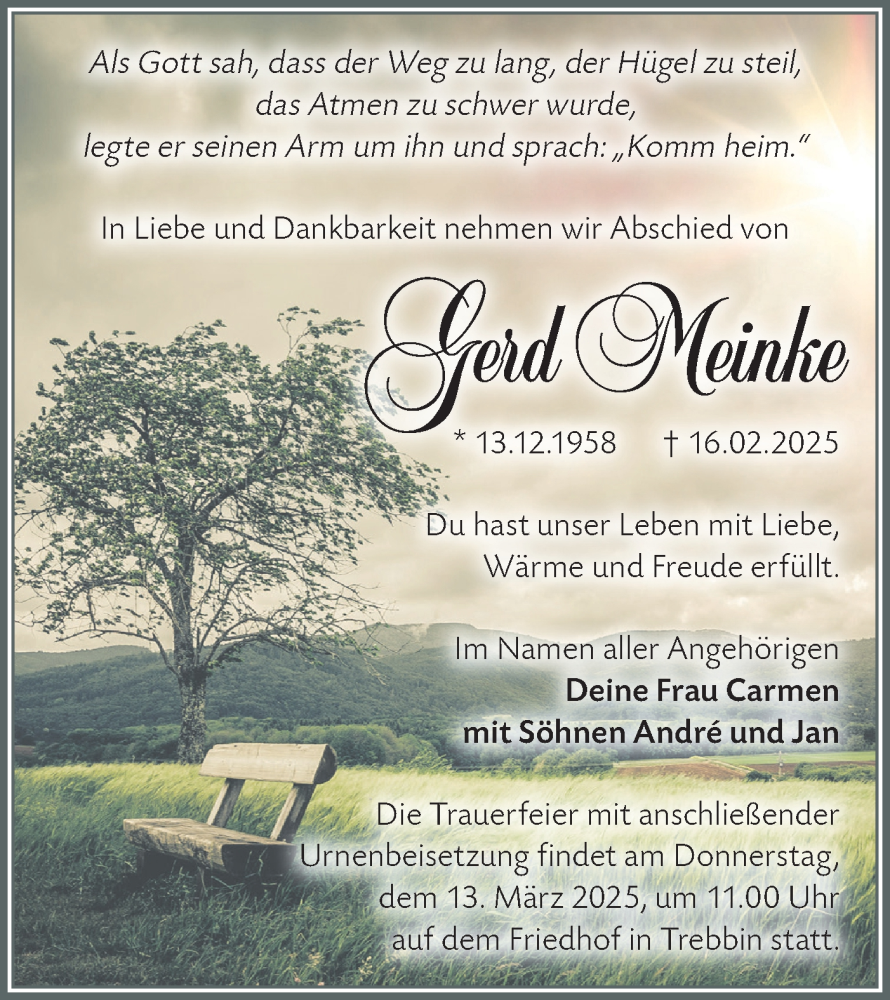 Hier finden Sie alle Traueranzeigen aus der Zeitung, die bisher für Gerd Meinke erschienen sind. Weitere Traueranzeigen, die in der Zeitung erscheinen, werden hier ebenfalls aufgelistet