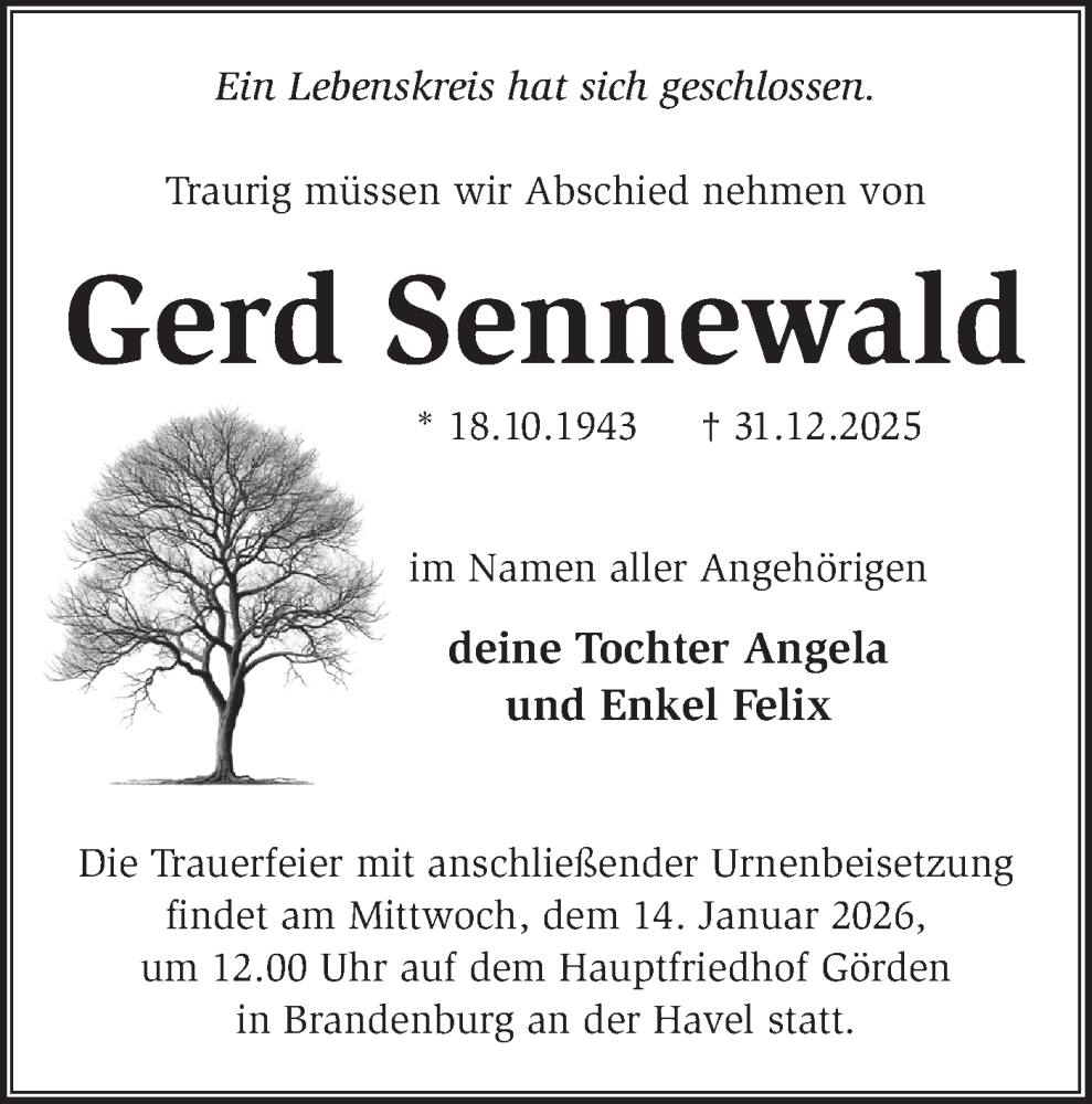 Hier finden Sie alle Traueranzeigen aus der Zeitung, die bisher für Gerd Sennewald erschienen sind. Weitere Traueranzeigen, die in der Zeitung erscheinen, werden hier ebenfalls aufgelistet