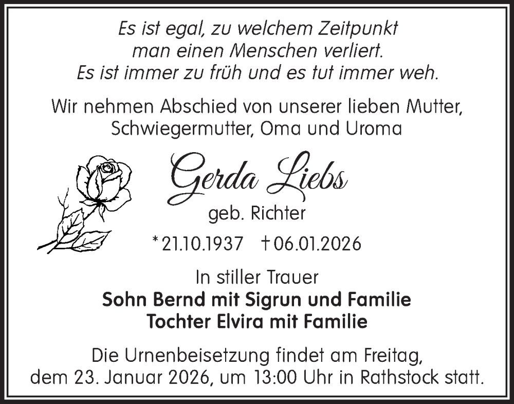 Hier finden Sie alle Traueranzeigen aus der Zeitung, die bisher für Gerda Liebs erschienen sind. Weitere Traueranzeigen, die in der Zeitung erscheinen, werden hier ebenfalls aufgelistet