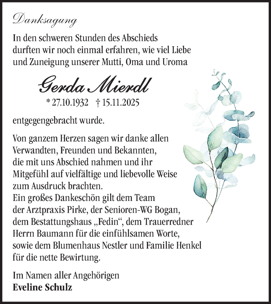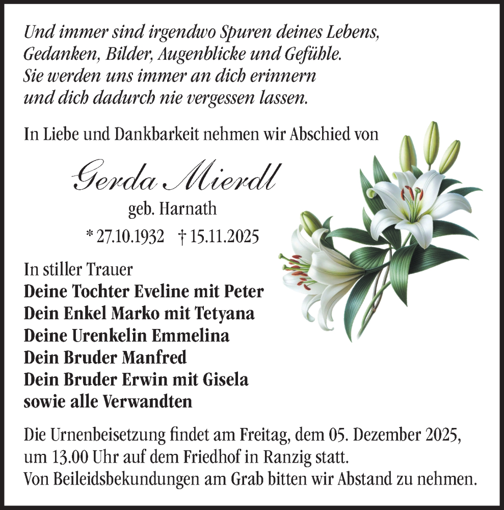 Hier finden Sie alle Traueranzeigen aus der Zeitung, die bisher für Gerda Mierdl erschienen sind. Weitere Traueranzeigen, die in der Zeitung erscheinen, werden hier ebenfalls aufgelistet