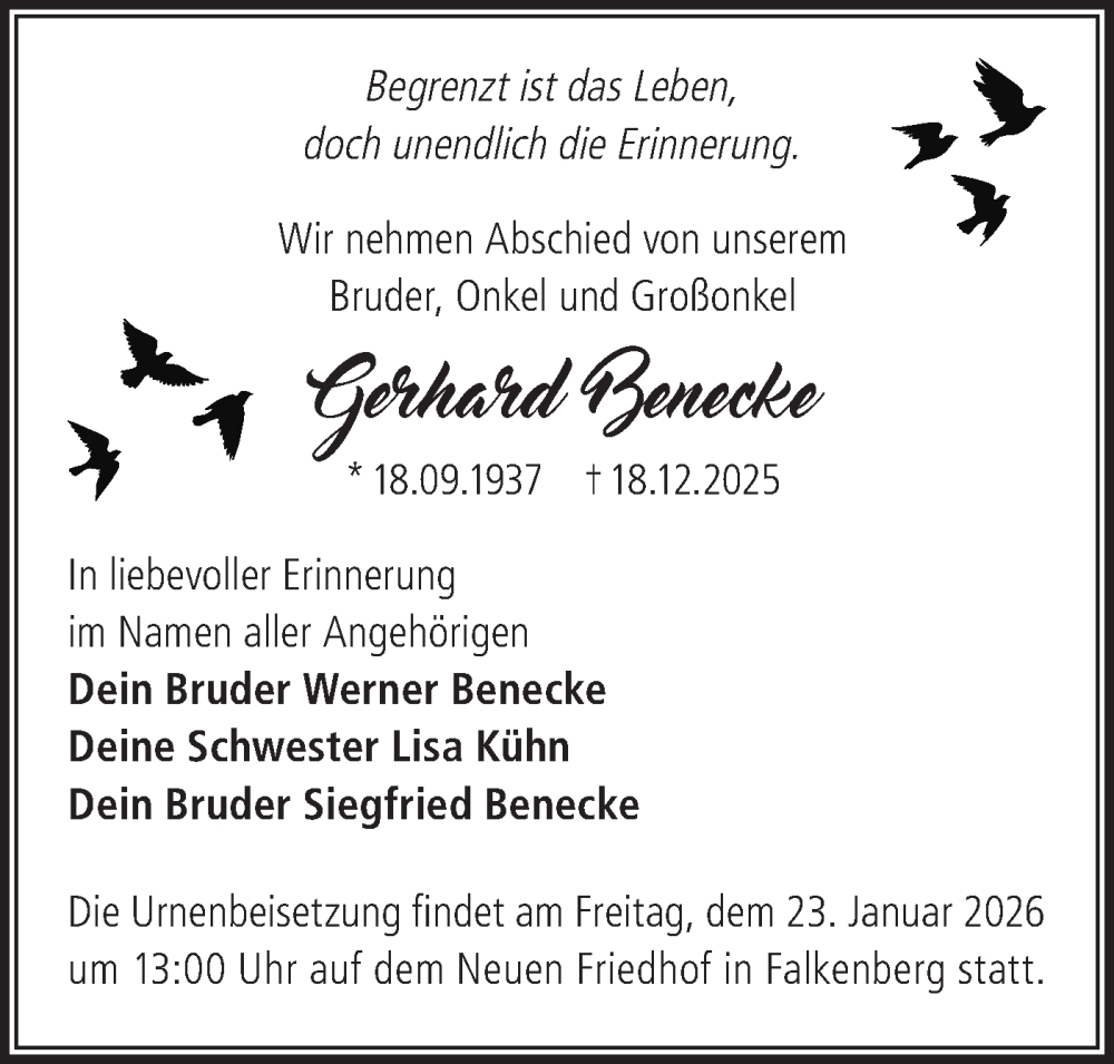 Hier finden Sie alle Traueranzeigen aus der Zeitung, die bisher für Gerhard Benecke erschienen sind. Weitere Traueranzeigen, die in der Zeitung erscheinen, werden hier ebenfalls aufgelistet