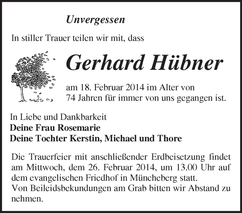 Hier finden Sie alle Traueranzeigen aus der Zeitung, die bisher für Gerhard Hübner erschienen sind. Weitere Traueranzeigen, die in der Zeitung erscheinen, werden hier ebenfalls aufgelistet