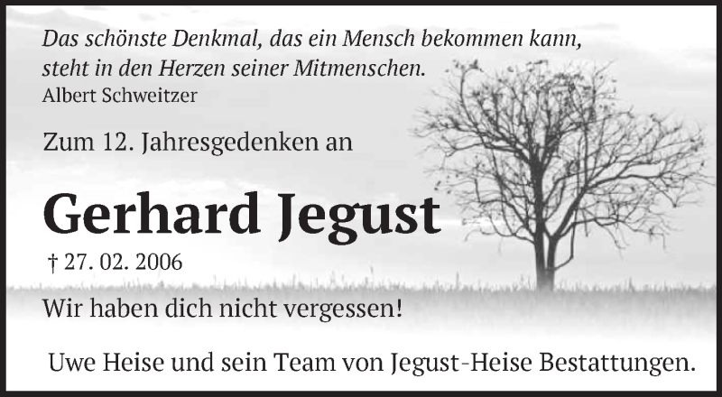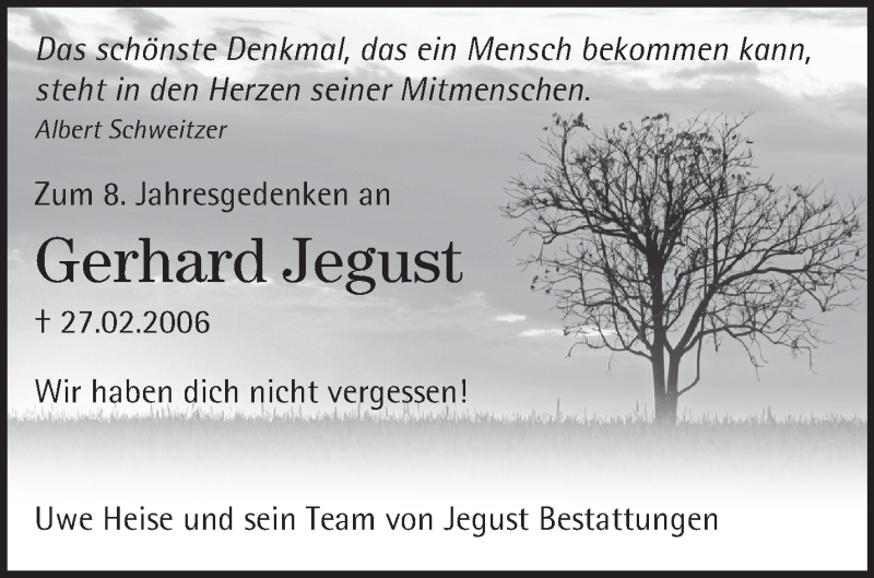 Hier finden Sie alle Traueranzeigen aus der Zeitung, die bisher für Gerhard Jegust erschienen sind. Weitere Traueranzeigen, die in der Zeitung erscheinen, werden hier ebenfalls aufgelistet