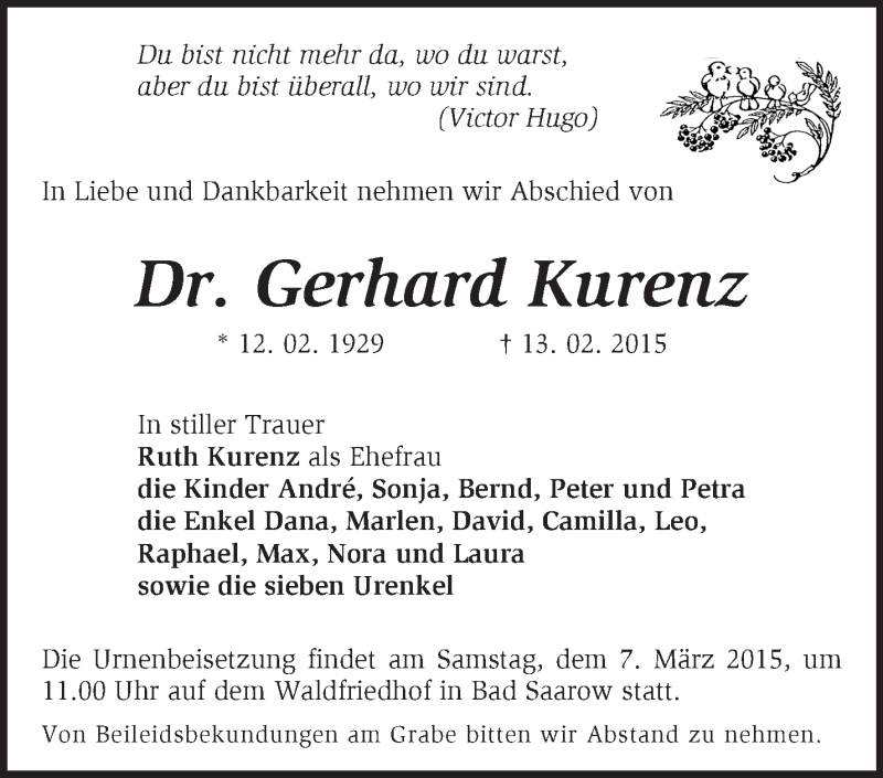 Hier finden Sie alle Traueranzeigen aus der Zeitung, die bisher für Gerhard Kurenz erschienen sind. Weitere Traueranzeigen, die in der Zeitung erscheinen, werden hier ebenfalls aufgelistet