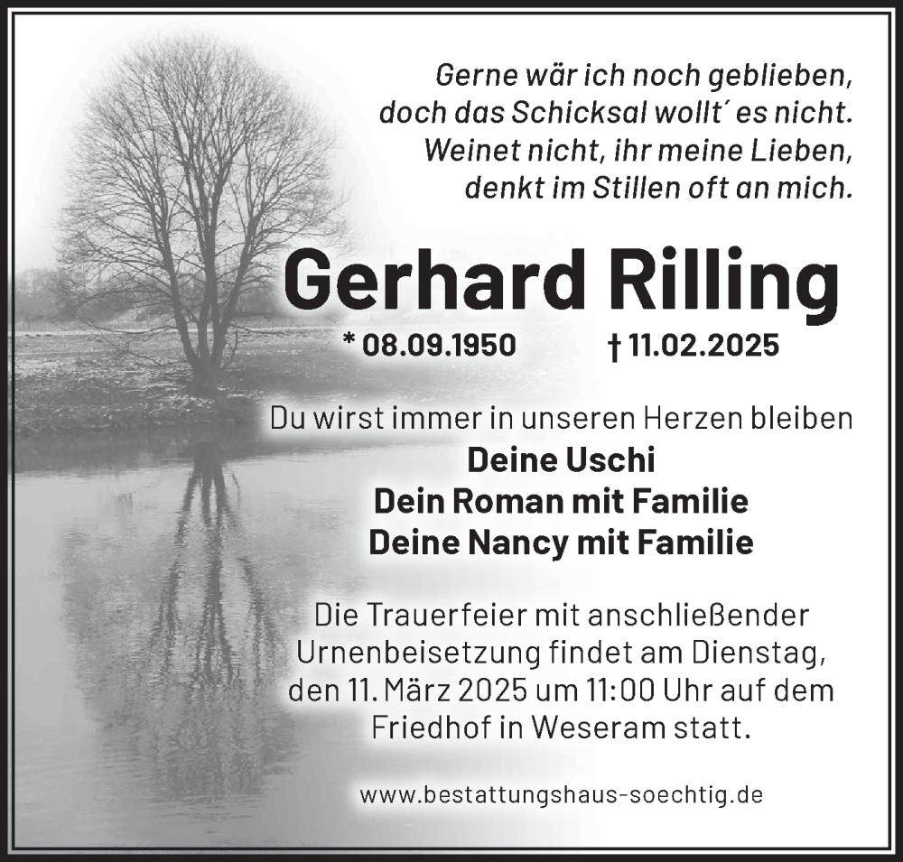 Hier finden Sie alle Traueranzeigen aus der Zeitung, die bisher für Gerhard Rilling erschienen sind. Weitere Traueranzeigen, die in der Zeitung erscheinen, werden hier ebenfalls aufgelistet