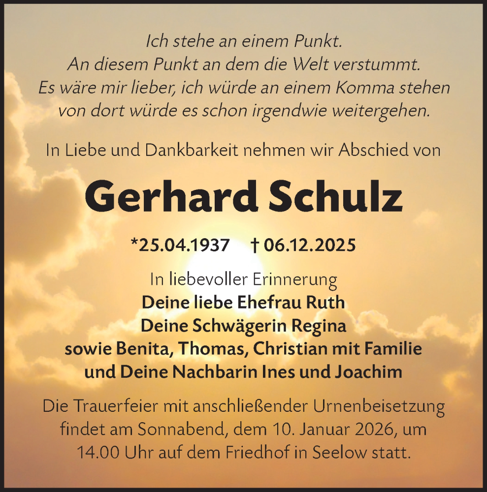 Hier finden Sie alle Traueranzeigen aus der Zeitung, die bisher für Gerhard Schulz erschienen sind. Weitere Traueranzeigen, die in der Zeitung erscheinen, werden hier ebenfalls aufgelistet
