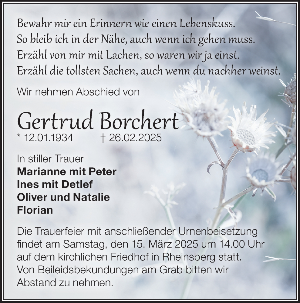 Hier finden Sie alle Traueranzeigen aus der Zeitung, die bisher für Gertrud Borchert erschienen sind. Weitere Traueranzeigen, die in der Zeitung erscheinen, werden hier ebenfalls aufgelistet