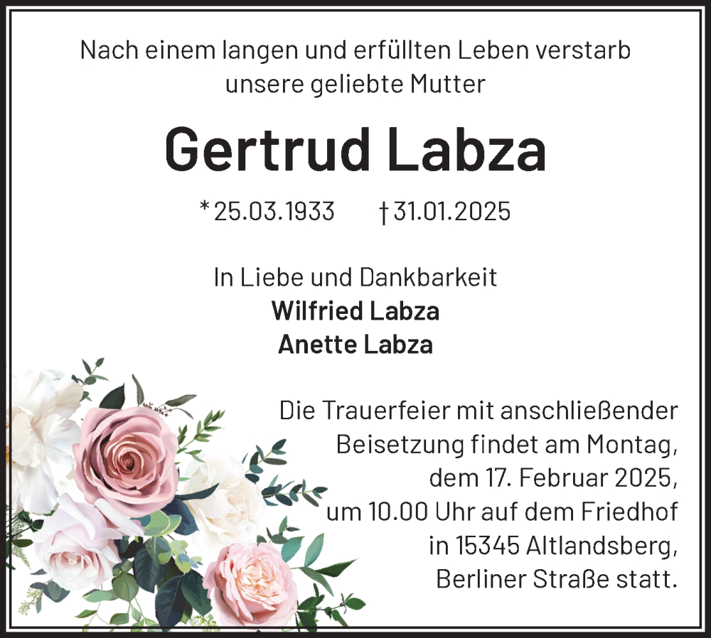 Hier finden Sie alle Traueranzeigen aus der Zeitung, die bisher für Gertrud Labza erschienen sind. Weitere Traueranzeigen, die in der Zeitung erscheinen, werden hier ebenfalls aufgelistet