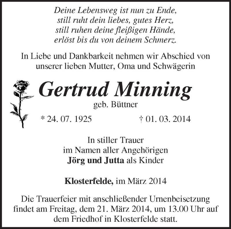 Hier finden Sie alle Traueranzeigen aus der Zeitung, die bisher für Gertrud Minning erschienen sind. Weitere Traueranzeigen, die in der Zeitung erscheinen, werden hier ebenfalls aufgelistet