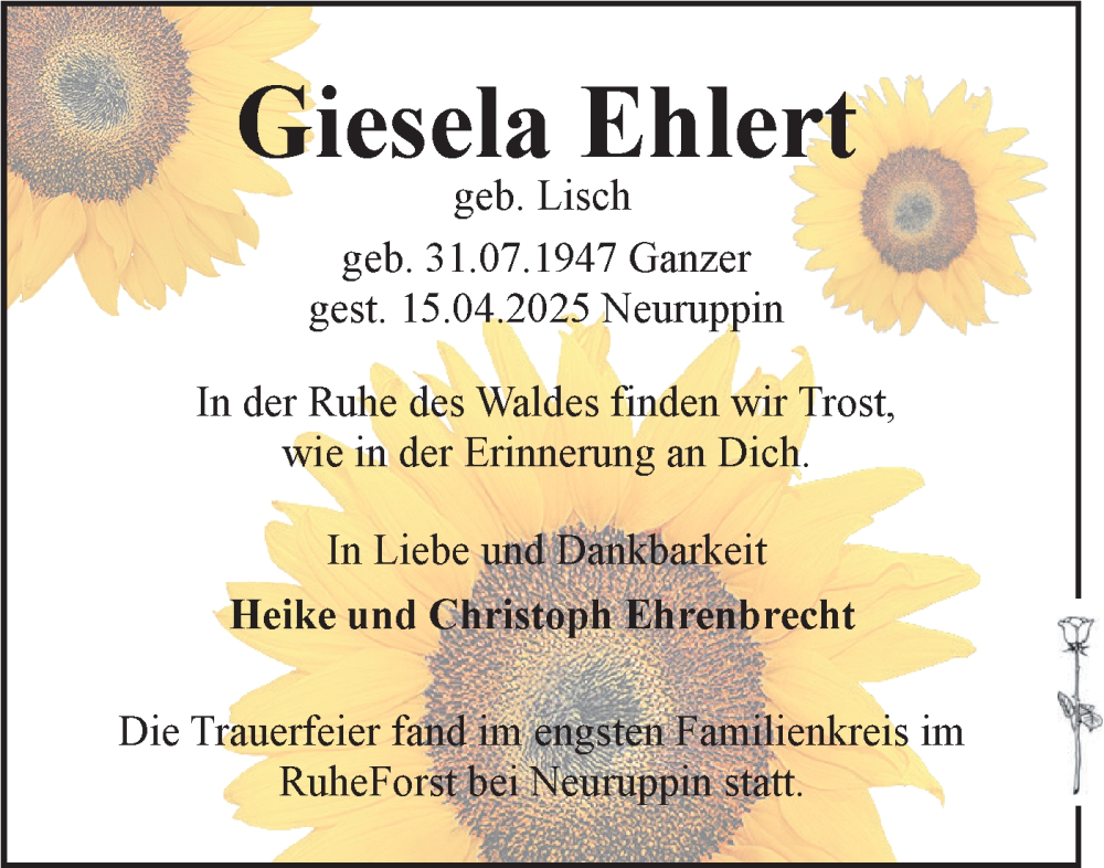 Hier finden Sie alle Traueranzeigen aus der Zeitung, die bisher für Giesela Ehlert erschienen sind. Weitere Traueranzeigen, die in der Zeitung erscheinen, werden hier ebenfalls aufgelistet
