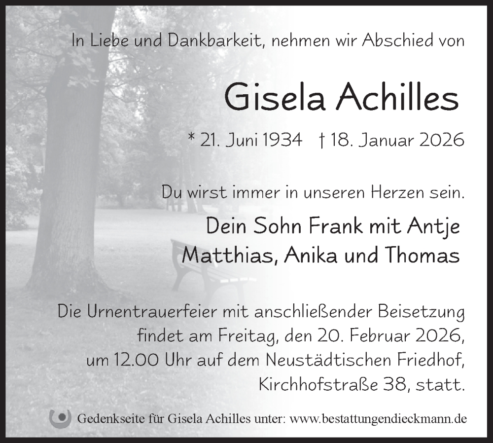 Hier finden Sie alle Traueranzeigen aus der Zeitung, die bisher für Gisela Achilles erschienen sind. Weitere Traueranzeigen, die in der Zeitung erscheinen, werden hier ebenfalls aufgelistet