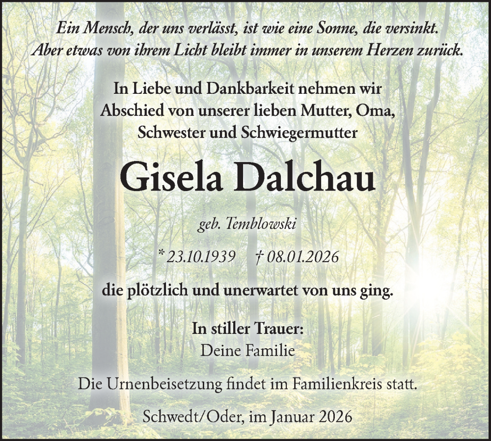 Hier finden Sie alle Traueranzeigen aus der Zeitung, die bisher für Gisela Dalchau erschienen sind. Weitere Traueranzeigen, die in der Zeitung erscheinen, werden hier ebenfalls aufgelistet