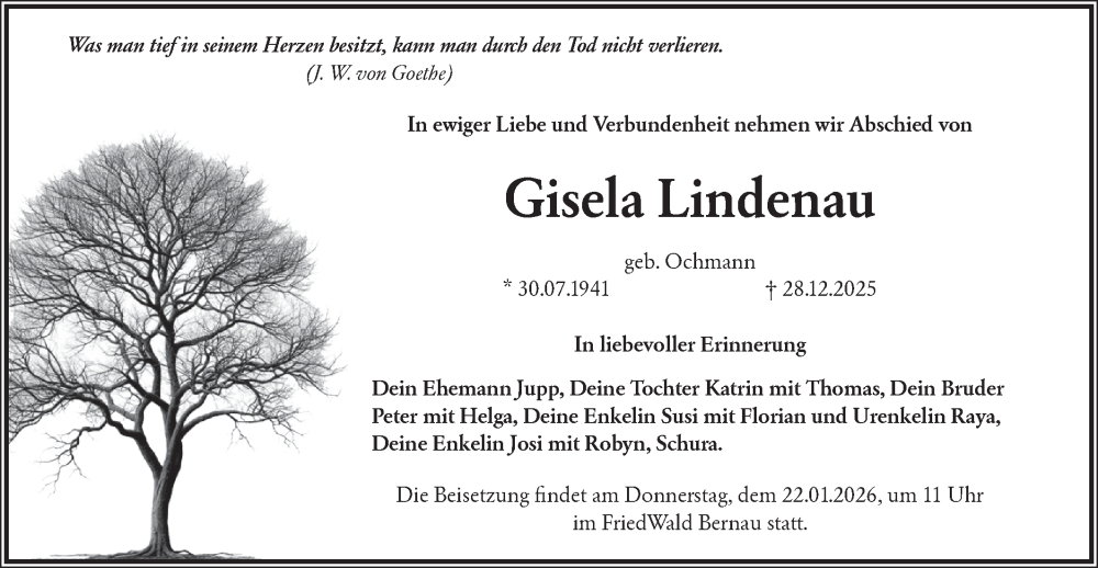 Hier finden Sie alle Traueranzeigen aus der Zeitung, die bisher für Gisela Lindenau erschienen sind. Weitere Traueranzeigen, die in der Zeitung erscheinen, werden hier ebenfalls aufgelistet