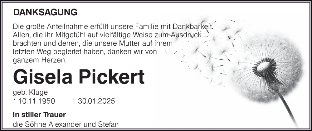 Hier finden Sie alle Traueranzeigen aus der Zeitung, die bisher für Gisela Pickert erschienen sind. Weitere Traueranzeigen, die in der Zeitung erscheinen, werden hier ebenfalls aufgelistet