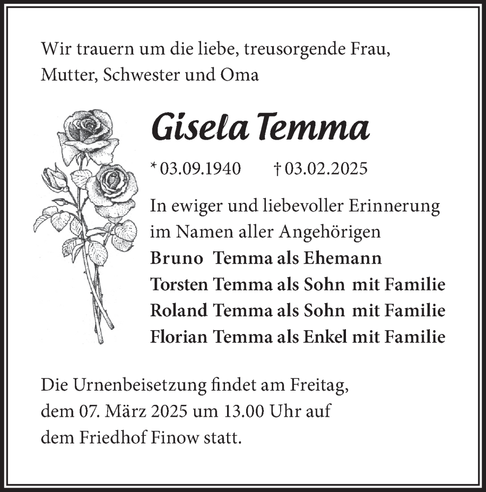 Hier finden Sie alle Traueranzeigen aus der Zeitung, die bisher für Gisela Temma erschienen sind. Weitere Traueranzeigen, die in der Zeitung erscheinen, werden hier ebenfalls aufgelistet