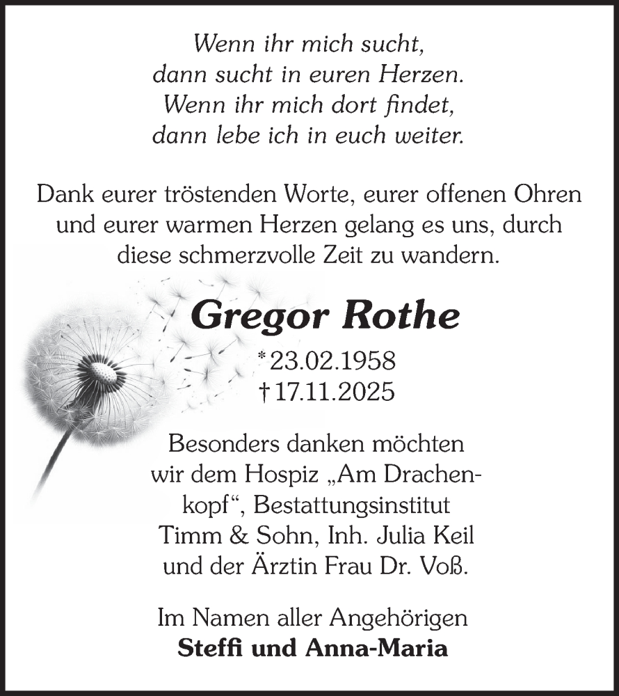 Hier finden Sie alle Traueranzeigen aus der Zeitung, die bisher für Gregor Rothe erschienen sind. Weitere Traueranzeigen, die in der Zeitung erscheinen, werden hier ebenfalls aufgelistet