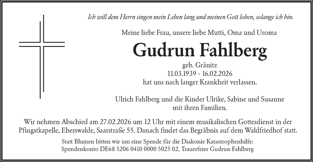 Hier finden Sie alle Traueranzeigen aus der Zeitung, die bisher für Gudrun Fahlberg erschienen sind. Weitere Traueranzeigen, die in der Zeitung erscheinen, werden hier ebenfalls aufgelistet