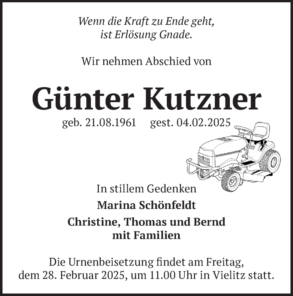 Hier finden Sie alle Traueranzeigen aus der Zeitung, die bisher für Günter Kutzner erschienen sind. Weitere Traueranzeigen, die in der Zeitung erscheinen, werden hier ebenfalls aufgelistet
