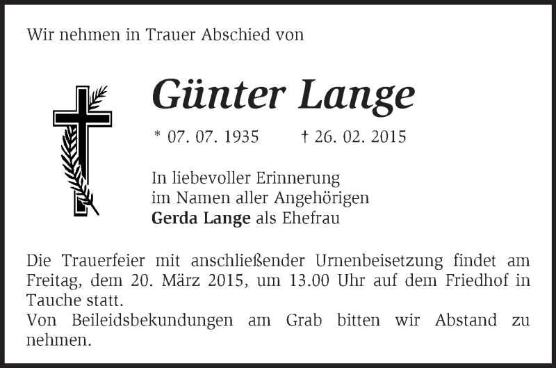 Hier finden Sie alle Traueranzeigen aus der Zeitung, die bisher für Günter Lange erschienen sind. Weitere Traueranzeigen, die in der Zeitung erscheinen, werden hier ebenfalls aufgelistet