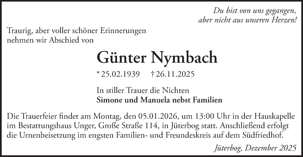Hier finden Sie alle Traueranzeigen aus der Zeitung, die bisher für Günter Nymbach erschienen sind. Weitere Traueranzeigen, die in der Zeitung erscheinen, werden hier ebenfalls aufgelistet