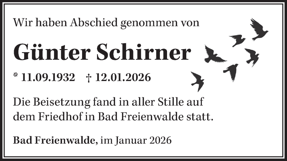 Hier finden Sie alle Traueranzeigen aus der Zeitung, die bisher für Günter Schirner erschienen sind. Weitere Traueranzeigen, die in der Zeitung erscheinen, werden hier ebenfalls aufgelistet