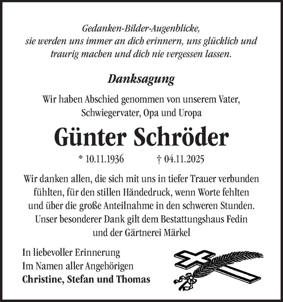 Hier finden Sie alle Traueranzeigen aus der Zeitung, die bisher für Günter Schröder erschienen sind. Weitere Traueranzeigen, die in der Zeitung erscheinen, werden hier ebenfalls aufgelistet