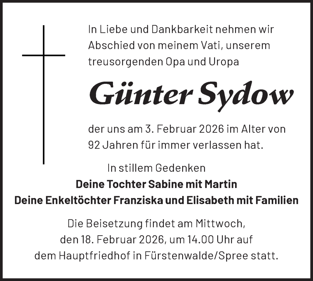 Hier finden Sie alle Traueranzeigen aus der Zeitung, die bisher für Günter Sydow erschienen sind. Weitere Traueranzeigen, die in der Zeitung erscheinen, werden hier ebenfalls aufgelistet