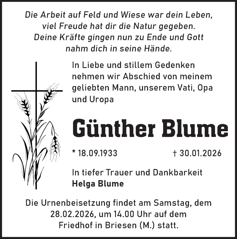 Hier finden Sie alle Traueranzeigen aus der Zeitung, die bisher für Günther Blume erschienen sind. Weitere Traueranzeigen, die in der Zeitung erscheinen, werden hier ebenfalls aufgelistet
