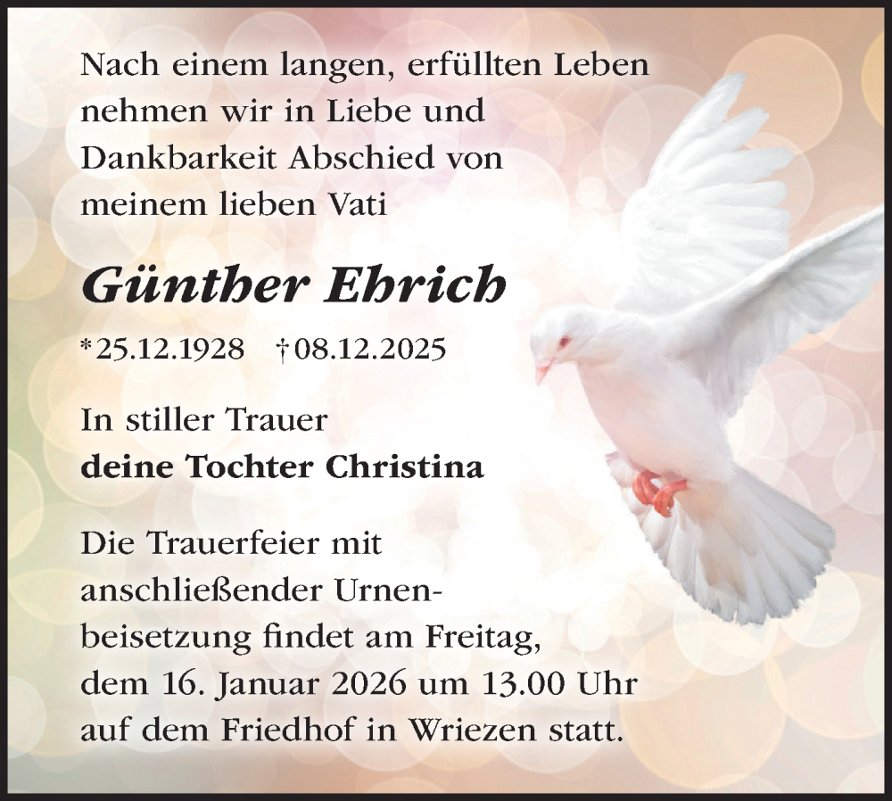 Hier finden Sie alle Traueranzeigen aus der Zeitung, die bisher für Günther Ehrich erschienen sind. Weitere Traueranzeigen, die in der Zeitung erscheinen, werden hier ebenfalls aufgelistet