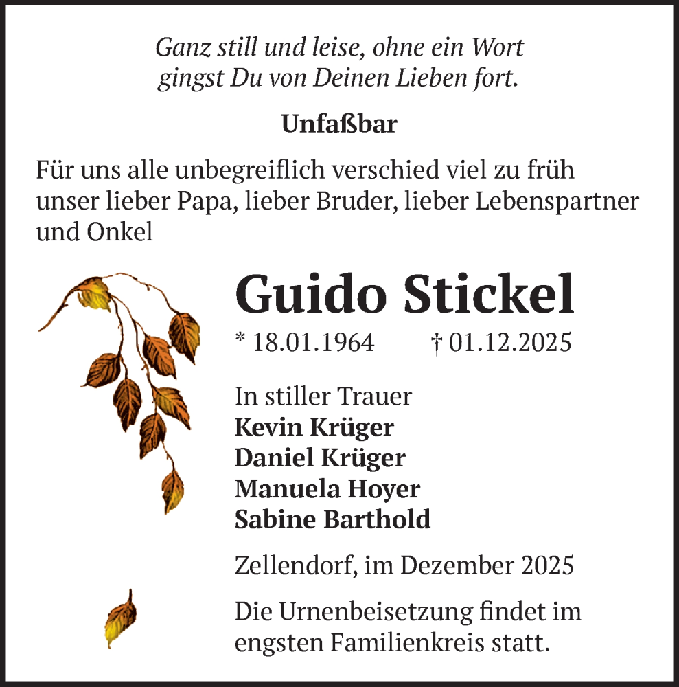 Hier finden Sie alle Traueranzeigen aus der Zeitung, die bisher für Guido Stickel erschienen sind. Weitere Traueranzeigen, die in der Zeitung erscheinen, werden hier ebenfalls aufgelistet