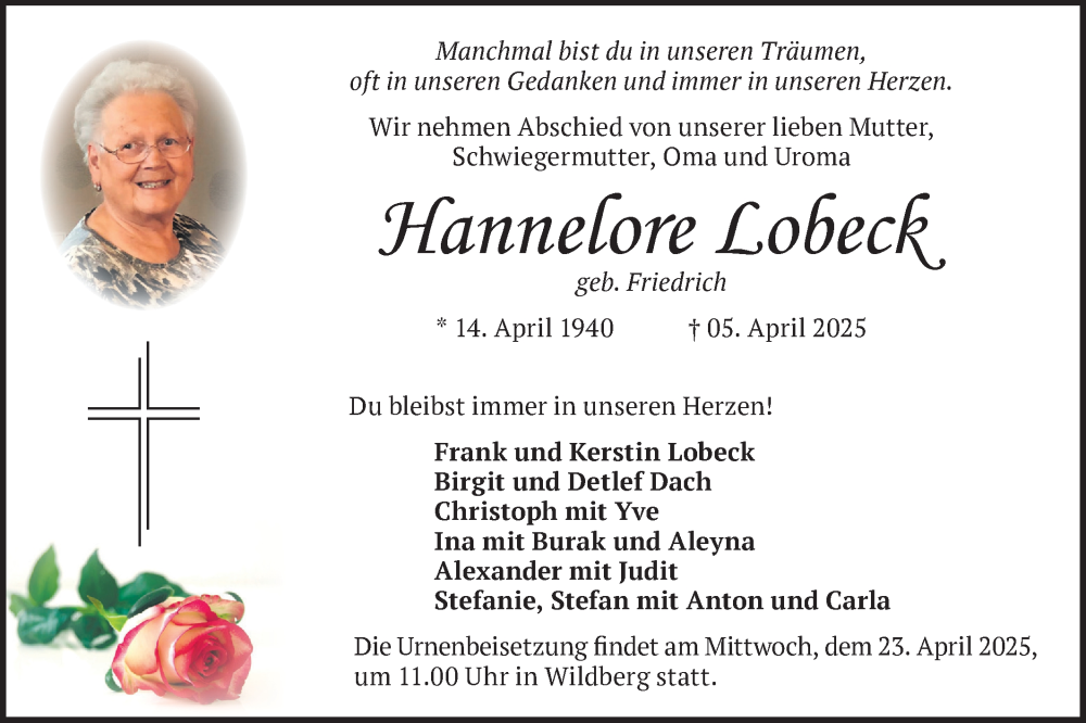Hier finden Sie alle Traueranzeigen aus der Zeitung, die bisher für Hannelore Lobeck erschienen sind. Weitere Traueranzeigen, die in der Zeitung erscheinen, werden hier ebenfalls aufgelistet