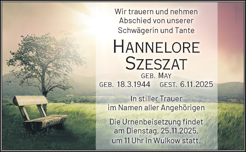 Hier finden Sie alle Traueranzeigen aus der Zeitung, die bisher für Hannelore Szeszat erschienen sind. Weitere Traueranzeigen, die in der Zeitung erscheinen, werden hier ebenfalls aufgelistet