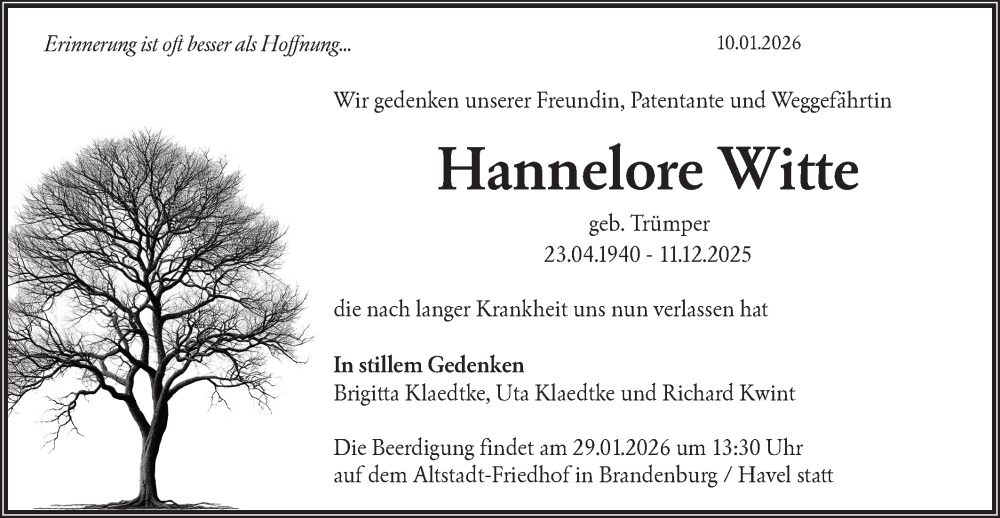 Hier finden Sie alle Traueranzeigen aus der Zeitung, die bisher für Hannelore Witte erschienen sind. Weitere Traueranzeigen, die in der Zeitung erscheinen, werden hier ebenfalls aufgelistet