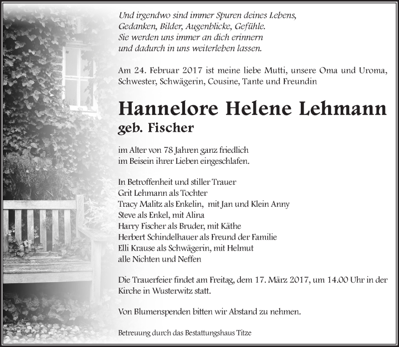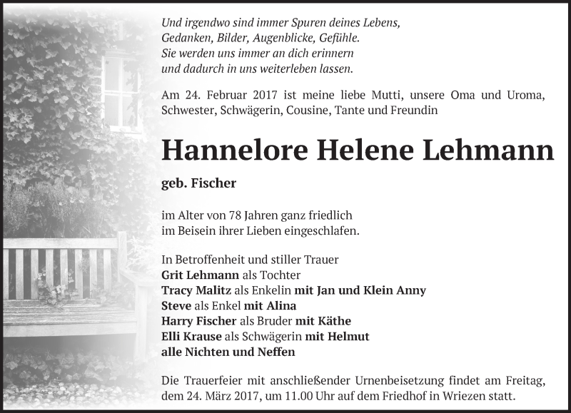 Hier finden Sie alle Traueranzeigen aus der Zeitung, die bisher für Hannelore Helene Lehmann erschienen sind. Weitere Traueranzeigen, die in der Zeitung erscheinen, werden hier ebenfalls aufgelistet