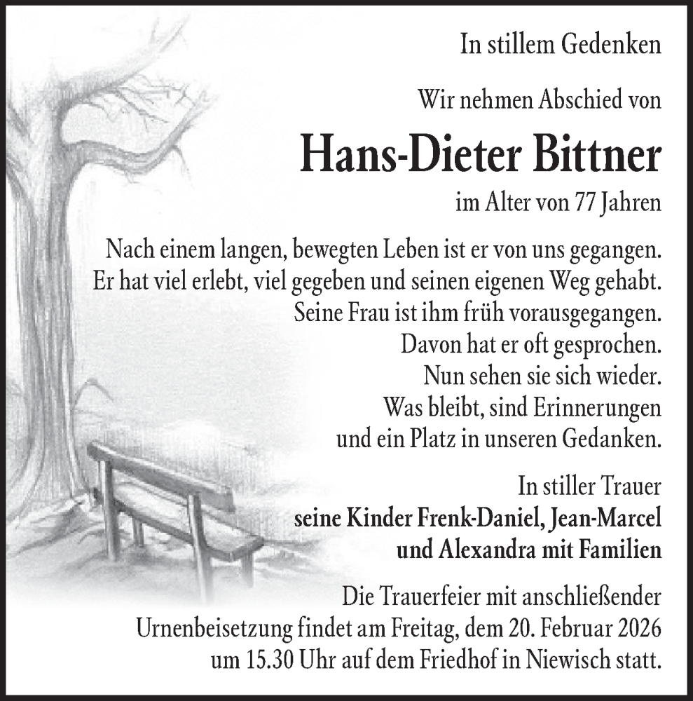 Hier finden Sie alle Traueranzeigen aus der Zeitung, die bisher für Hans-Dieter Bittner erschienen sind. Weitere Traueranzeigen, die in der Zeitung erscheinen, werden hier ebenfalls aufgelistet