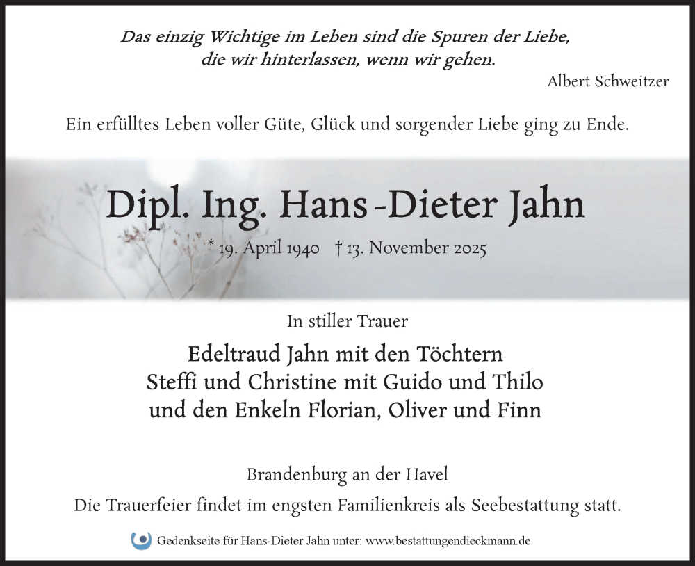 Hier finden Sie alle Traueranzeigen aus der Zeitung, die bisher für Hans-Dieter Jahn erschienen sind. Weitere Traueranzeigen, die in der Zeitung erscheinen, werden hier ebenfalls aufgelistet