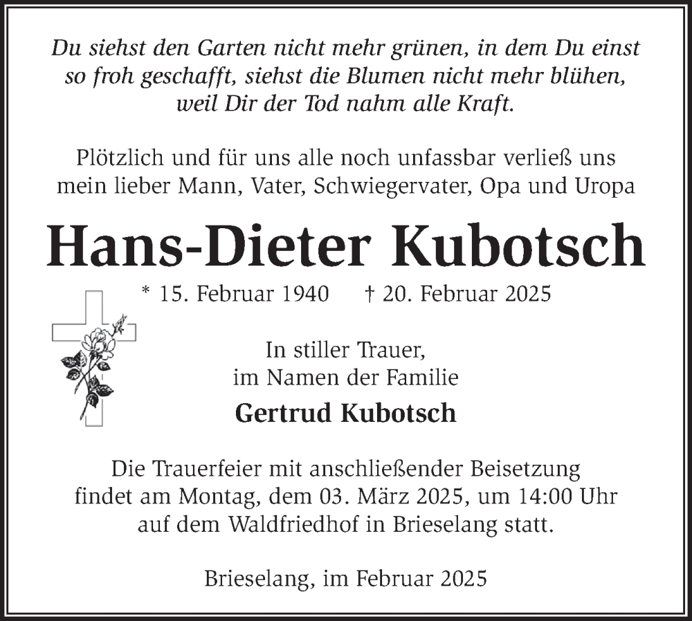 Hier finden Sie alle Traueranzeigen aus der Zeitung, die bisher für Hans-Dieter Kubotsch erschienen sind. Weitere Traueranzeigen, die in der Zeitung erscheinen, werden hier ebenfalls aufgelistet