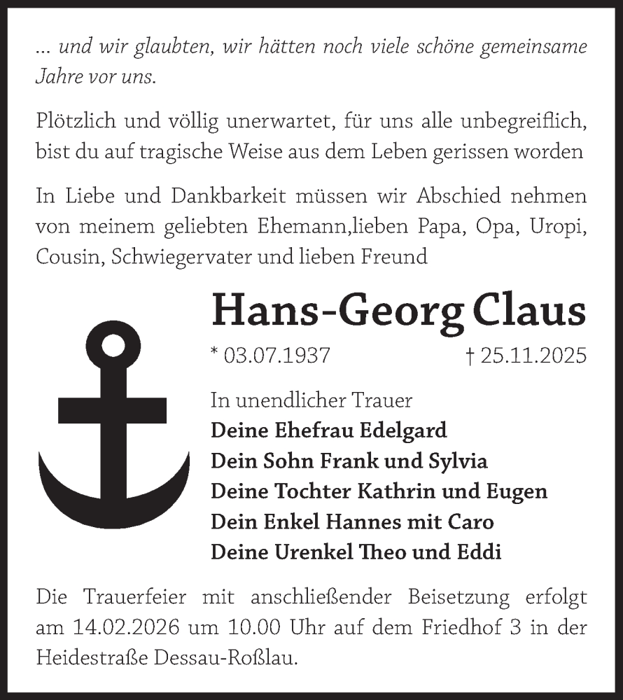 Hier finden Sie alle Traueranzeigen aus der Zeitung, die bisher für Hans-Georg Claus erschienen sind. Weitere Traueranzeigen, die in der Zeitung erscheinen, werden hier ebenfalls aufgelistet