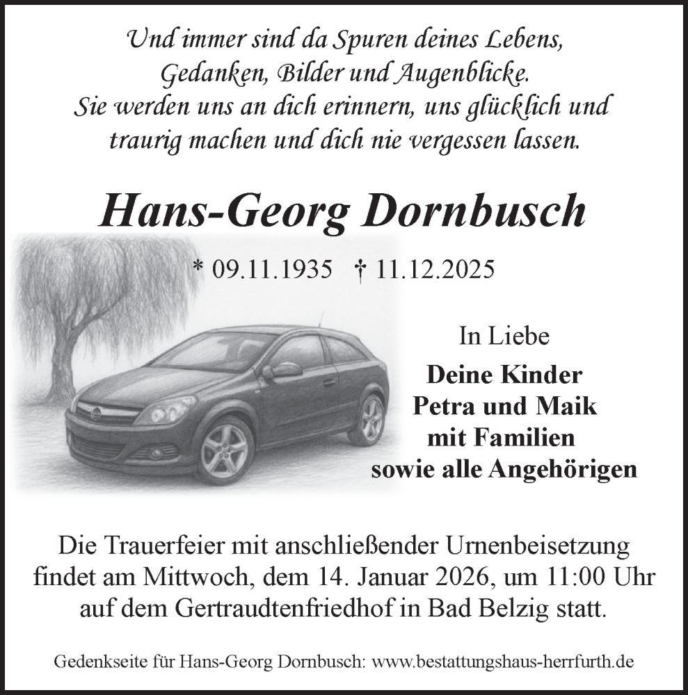 Hier finden Sie alle Traueranzeigen aus der Zeitung, die bisher für Hans-Georg Dornbusch erschienen sind. Weitere Traueranzeigen, die in der Zeitung erscheinen, werden hier ebenfalls aufgelistet