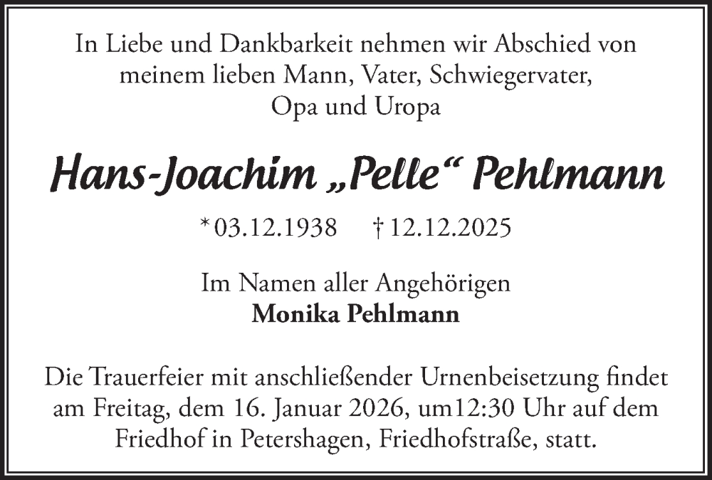 Hier finden Sie alle Traueranzeigen aus der Zeitung, die bisher für Hans-Joachim Pehlmann erschienen sind. Weitere Traueranzeigen, die in der Zeitung erscheinen, werden hier ebenfalls aufgelistet
