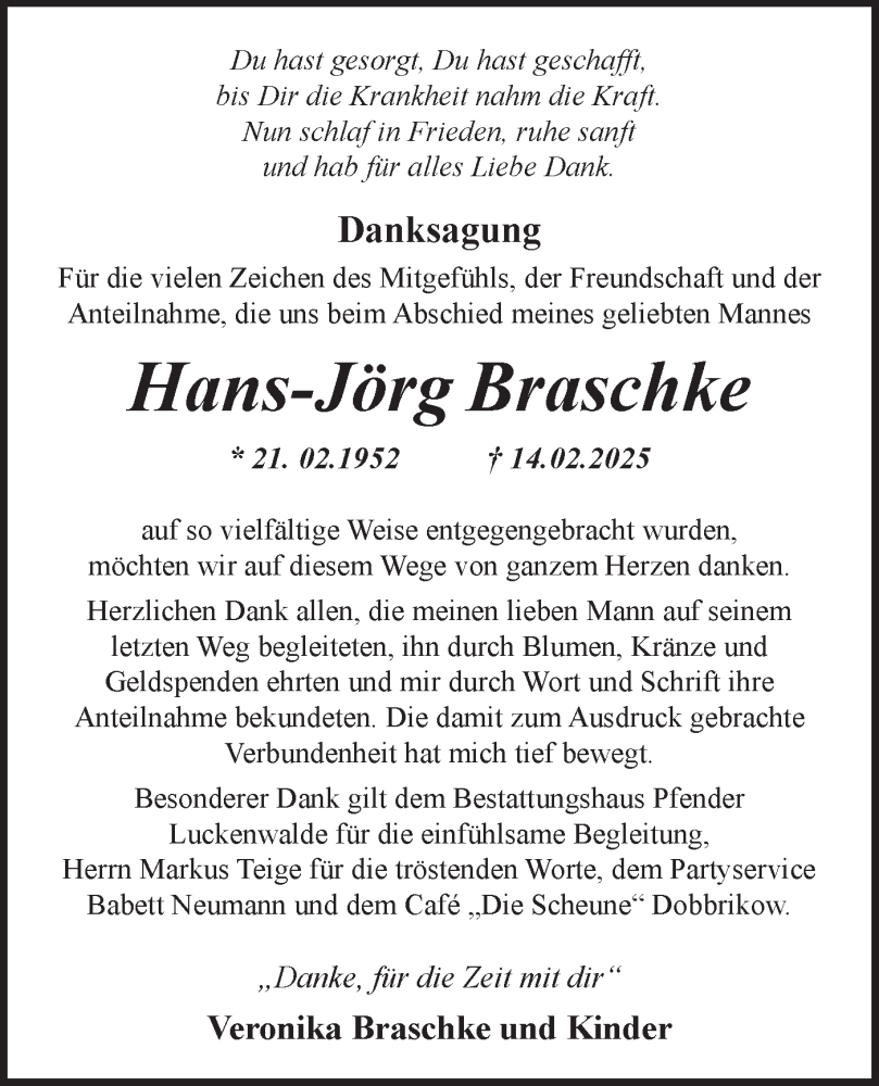 Hier finden Sie alle Traueranzeigen aus der Zeitung, die bisher für Hans-Jörg Braschke erschienen sind. Weitere Traueranzeigen, die in der Zeitung erscheinen, werden hier ebenfalls aufgelistet