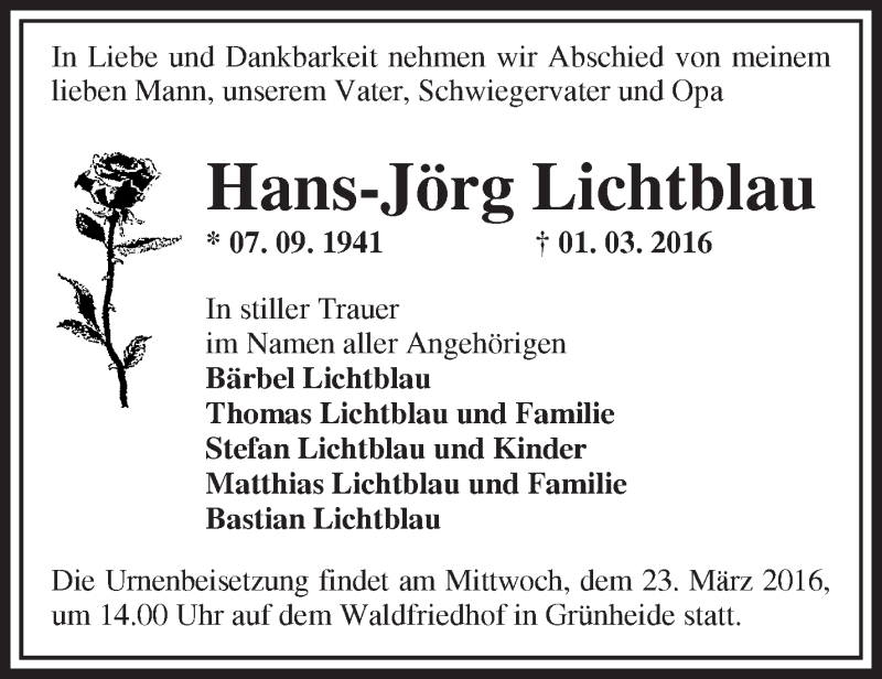 Hier finden Sie alle Traueranzeigen aus der Zeitung, die bisher für Hans-Jörg Lichtblau erschienen sind. Weitere Traueranzeigen, die in der Zeitung erscheinen, werden hier ebenfalls aufgelistet