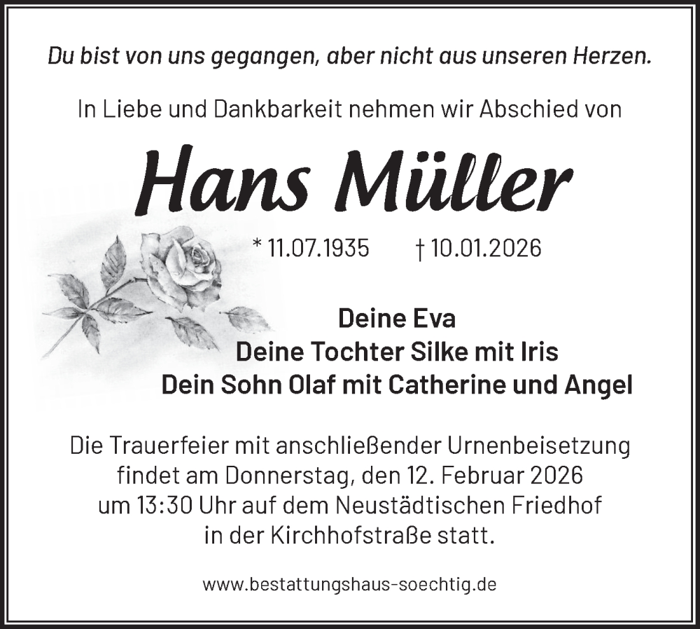 Hier finden Sie alle Traueranzeigen aus der Zeitung, die bisher für Hans Müller erschienen sind. Weitere Traueranzeigen, die in der Zeitung erscheinen, werden hier ebenfalls aufgelistet