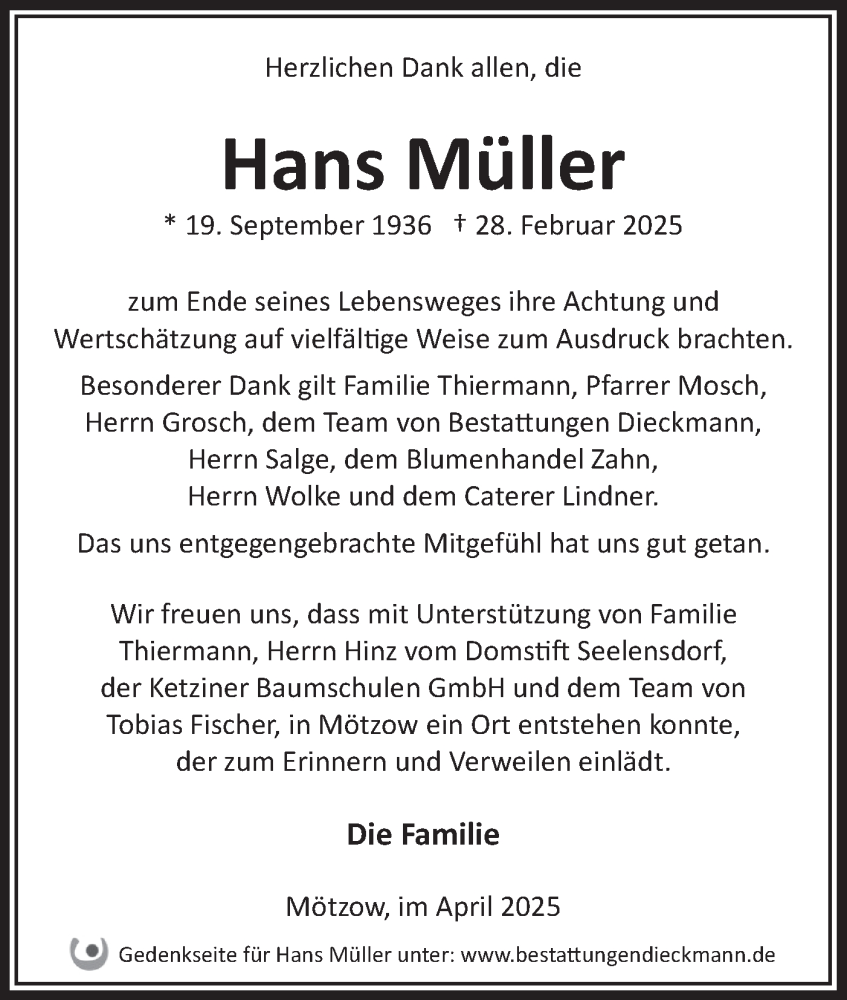 Hier finden Sie alle Traueranzeigen aus der Zeitung, die bisher für Hans Müller erschienen sind. Weitere Traueranzeigen, die in der Zeitung erscheinen, werden hier ebenfalls aufgelistet