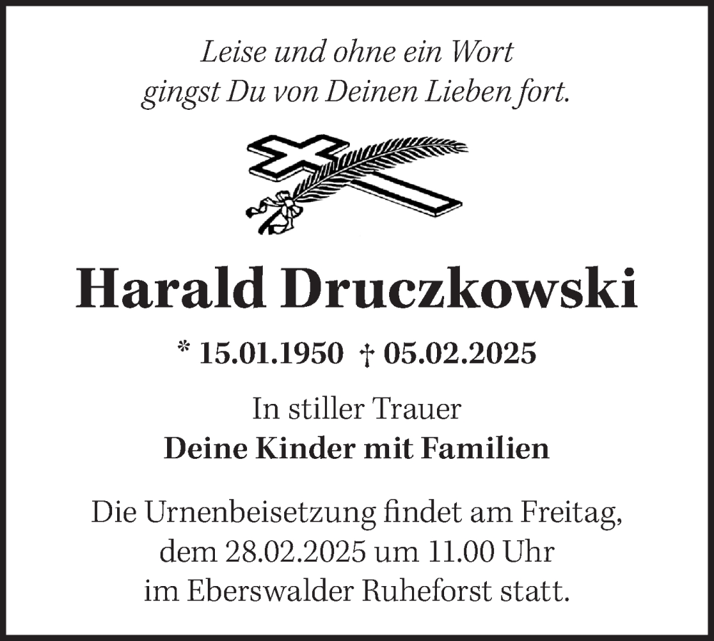 Hier finden Sie alle Traueranzeigen aus der Zeitung, die bisher für Harald Druczkowski erschienen sind. Weitere Traueranzeigen, die in der Zeitung erscheinen, werden hier ebenfalls aufgelistet