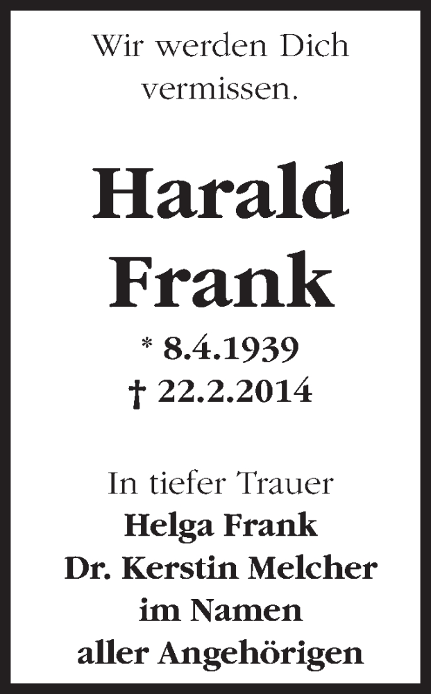 Hier finden Sie alle Traueranzeigen aus der Zeitung, die bisher für Harald Frank erschienen sind. Weitere Traueranzeigen, die in der Zeitung erscheinen, werden hier ebenfalls aufgelistet