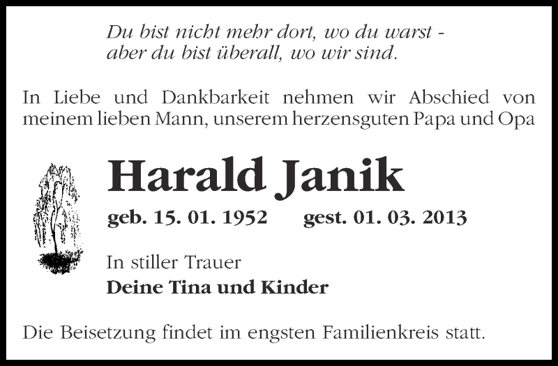 Hier finden Sie alle Traueranzeigen aus der Zeitung, die bisher für Harald Janik erschienen sind. Weitere Traueranzeigen, die in der Zeitung erscheinen, werden hier ebenfalls aufgelistet